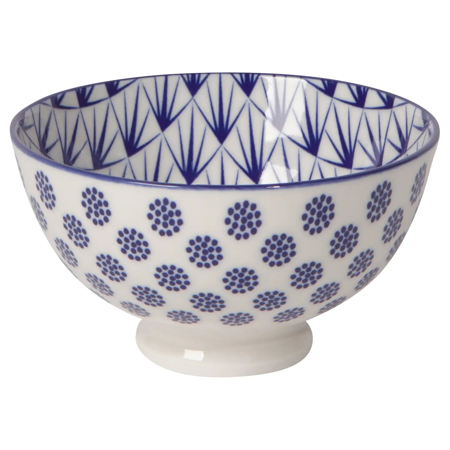 Complement culinary adventures with this intriguing two-in-one patterned blue dots 4-inch stamped porcelain bowl by now designs. Sweet and sour, hot and cold, accentuate your culinary skills with this contrary container. Size: dia4 x h2.5in, 10 oz Material content: porcelain Care instructions: dishwasher & microwave safe